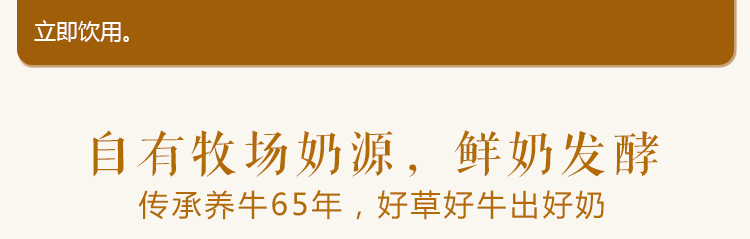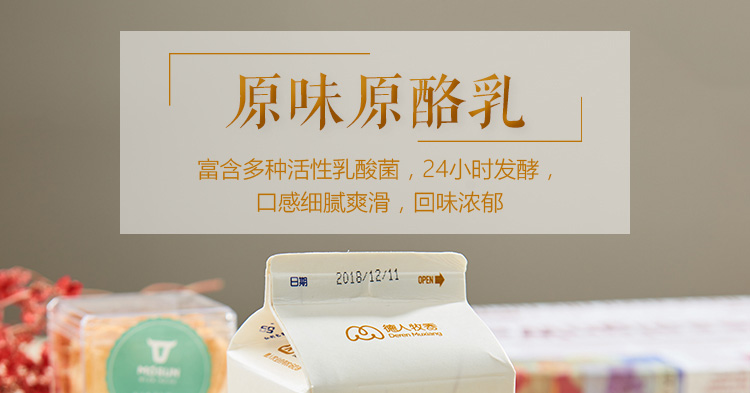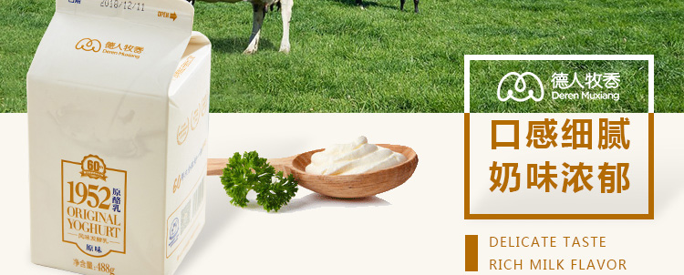 精選德人牧業(yè)自有牧場(chǎng)優(yōu)質(zhì)奶源、歐洲進(jìn)口菌種發(fā)酵而成??诟屑?xì)膩,奶香濃郁,入口純滑。產(chǎn)品無(wú)穩(wěn)定劑、無(wú)防腐劑、無(wú)著色劑,原滋原味!能夠緩解腸胃不適、促進(jìn)消化吸收,并具有解酒的功效。